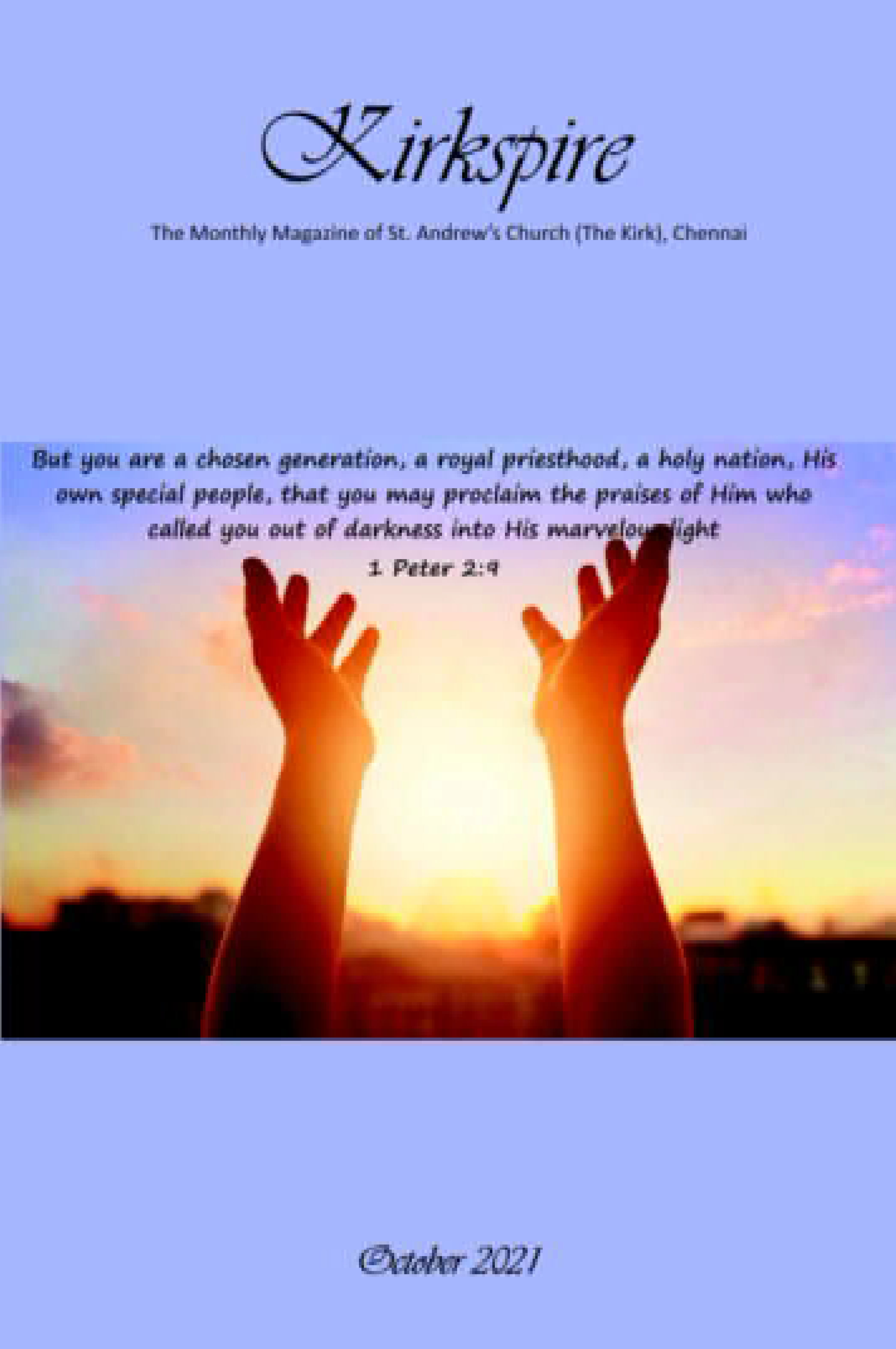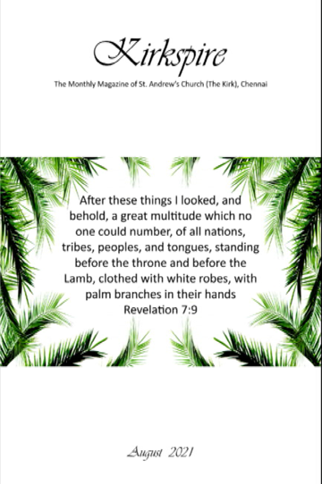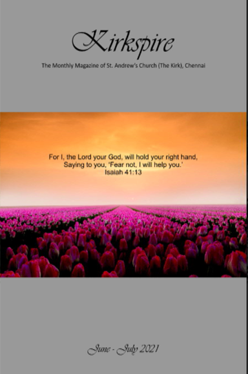 St. Andrew's church is the most beautiful church in India and one of the most ancient. It is 204 years old this year, and its steeple soars 166 feet into the sky. It is in celebration to this tall steeple that our monthly magazine is called ' Kirkspire'. St. Andrew's Church was build for the Scottish community in Madras in 1821 and so in the early years the monthly magazine was brought out as a supplement to "Life and Work" Church of Scotland, Parish magazine of St. Andrew's Church, Madras. It was a very small publication of 4 pages or so, and the contents were - the cover page with the masthead and the name of the chaplain, notices giving information about the services, notes of happenings in the Kirk, in the Presidency of Madras and the wider world, the church registry which recorded births, marriages and deaths and a statement of church accounts. Although St. Andrews did have its newsletters earlier, the magazine in its present form appeared 52 years ago. The Kirkspire comes out on the second Sunday of every month and is placed at the three entrances of the Church. A chairperson and an editorial committee oversee the running of the magazine. The KIRKSPIRE is meant to be a ministry in print for the congregation. It reflects the thoughts, beliefs and aspirations of the congregation. The magazine mostly depends on their contributions instead of borrowed articles from other publications. The first article is always a message from the minister. Then follows articles intended to help the readers in their walk of faith. Poems, jokes and even a medical column find a place in the magazine. The KIRK news is generally presented last. This details all the happenings of the past month including births, deaths, marriages and the activities of the various projects of the church. Recently the printing of photographs too has been included. Apart from local circulation a few copies are sent by post within the country & abroad. Those who have been part of our congregation, but are now away from Chennai appreciate this very much. We thank our Almighty God for sustaining this magazine over the past so many years and for making it an integral part of the ministry of St. Andrew's Church.